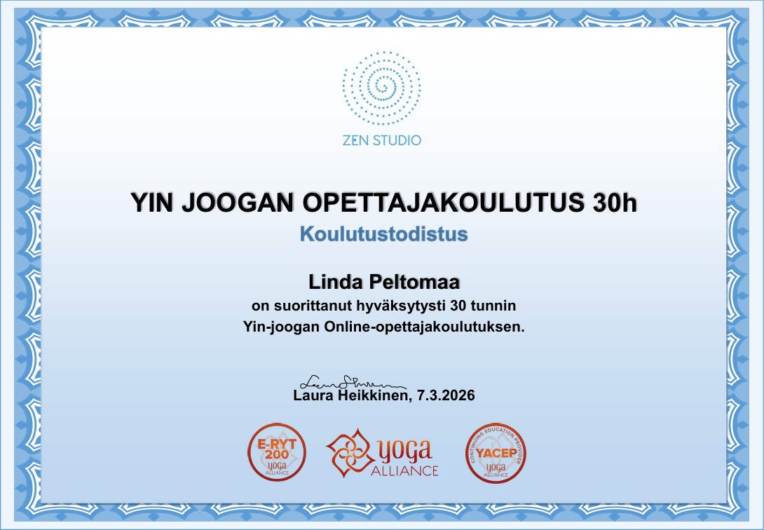 Mindfulness on ollut iso osa elämääni jo n. 14 vuotta. Sertifioidun meditointivalmentajan opinnot olen suorittanut vuonna 2024. AMK- opintojen ohessa suoritin "Mindfulness työelämässä"- kurssin (SAMK) vuonna 2023. Yin joogan opettajakoulutuksen suoritin keväällä 2026. Tällä hetkellä opiskelen myös äänimaljahoitajan opintoja.